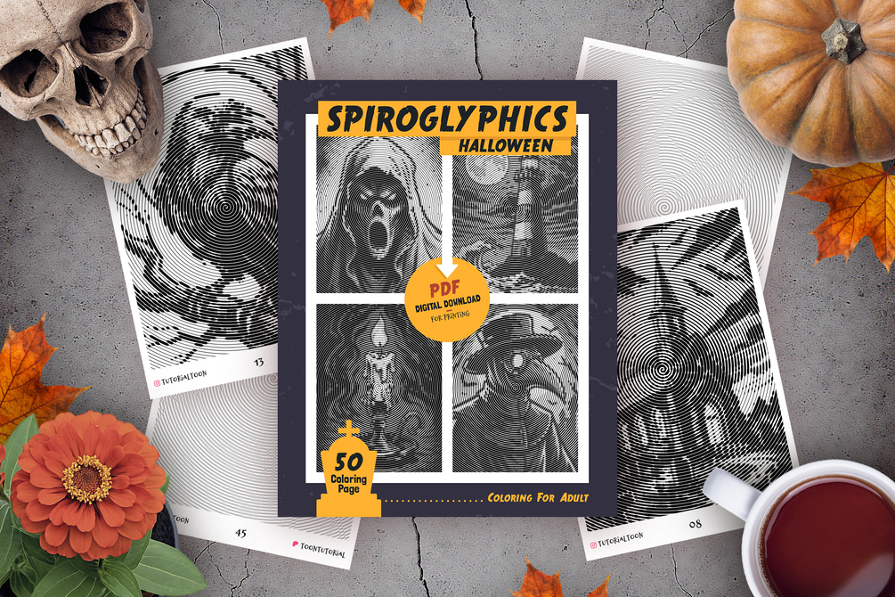 - 50 Spiroglyphics Coloring Pages: A whole bunch of Halloween themed designs, all different. I put a lot of love into drawing each page.